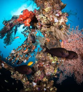 It’s about feeling it. As you approach, the structure appears slowly through the water—not as a clear object, but as a shape blending into the reef. Coral has softened its edges. Marine life has filled its empty spaces. It doesn’t feel broken. It feels absorbed. There is a moment when you realize this ship is no longer separate from the ocean. It belongs here now. And in a quiet way, you are just passing through its space. That feeling stays longer than any photo.